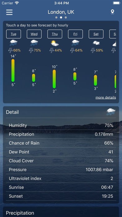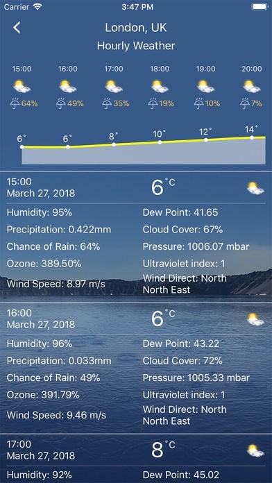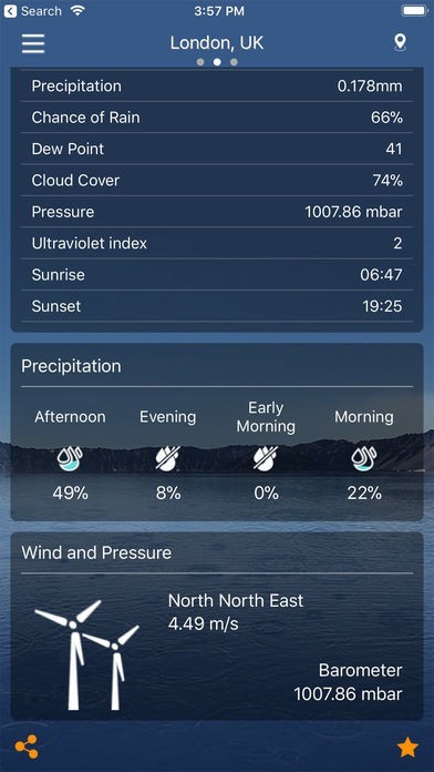 天気予報では現在地の天気を自動的に検出します。天気予報には、気象条件、気圧、相対湿度、視界距離、異なる単位の降水量、露点、風速と方向、10日間の将来予測、毎時の天気予報などの多くの情報があります。