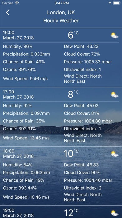 - フルレポート。天候のすべての情報を表示します:場所時間、気温、気圧、気象条件、可視距離、相対湿度、異なる単位の降水量、露点、風速と方向...