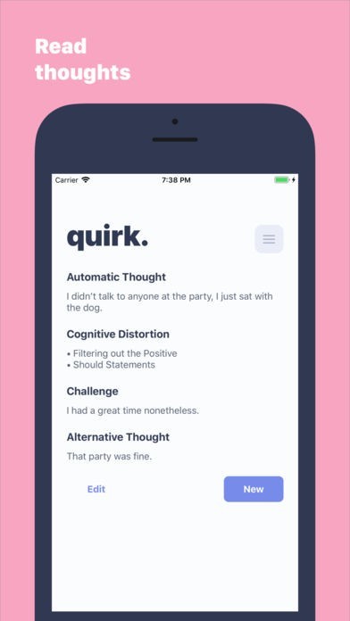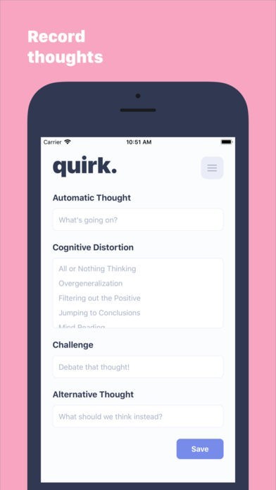 Quirk helps you record "automatic thoughts," challenge them, and then train your brain with an alternative thought.