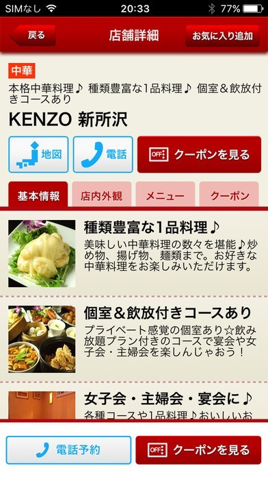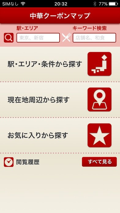 アプリ「中華クーポンマップ」は、全国の中華料理店にジャンルをしぼり、選りすぐりのおすすめ店舗をクーポンつきで紹介してくれるアプリです。食べたい料理名をフリーワード検索してお店を調べることもできますし、急に中華料理が食べたいと思ったときには、アプリを起動すれば、現在の位置情報をもとに近くのお店をピックアップしてくれますよ。もちろん、お店の名前だけでなく、店舗紹介やメニューの紹介も充実していますので、気軽にお店を選べますよ。