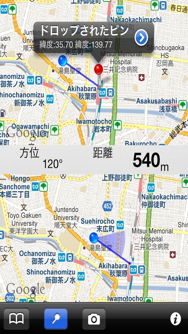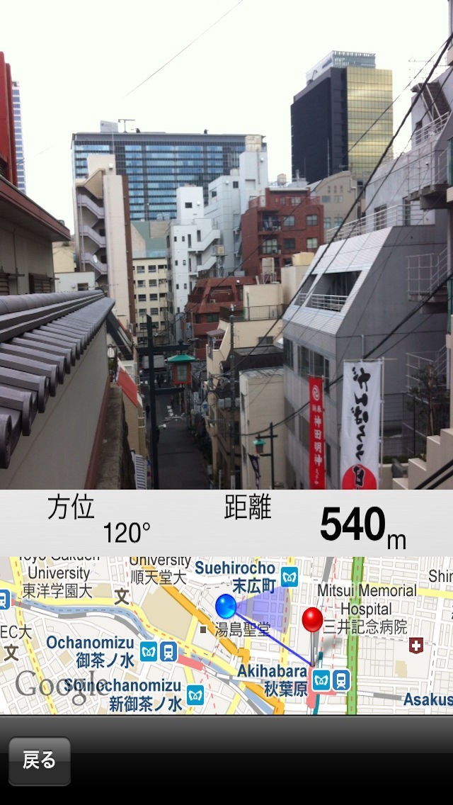 目的地までの距離と方向と、現在端末が向いている方向が表示されるので、地図を見るのが苦手な方でも進む方向がすぐに分かります。