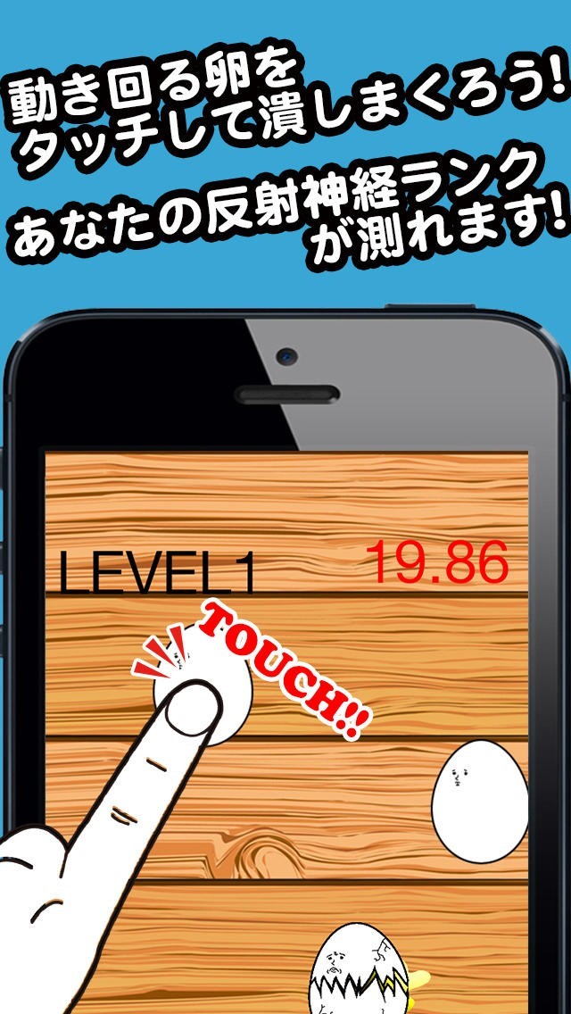 画面を素早く動き回るたまごをタッチすることでつぶしていくゲームです。レベル1~5まであり、レベルが上がるごとにたまごが動き回るスピードも上がっていくので、反射神経を駆使してたまごの動きについていきます。たまごの動きを捉えてつぶせた時には、達成感が得られると共にストレスも解消できます。クリアタイムによってスコアとランキングが決定するので、できるだけ早くつぶすことがハイスコアへの鍵です。良い結果なら褒められ、悪い結果だとけなされるので、次へのモチベーションになります。1回あたり数十秒でプレイできるので、ちょっとした空き時間でも手軽に遊べます。