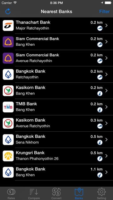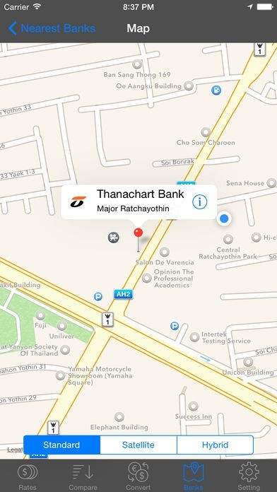 Thai Baht Exchangeではタイの主要銀行の地図を表示する機能が用意されており、電話番号や所在地などの情報が閲覧することができ、最もレートの高い両替ができる銀行を探す際にも便利です