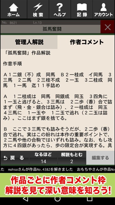 「詰将棋パラダイス」は、毎日更新される詰将棋を好きなだけ解くことができるアプリです。詰将棋のタイムアタックランキングが表示されるので、自分の全国での位置がわかります。また、自作の詰将棋を作成して発表することもできます。投稿する際には、コメントをつけることができるので、自分の意図や面白いと思う部分などを自由に解説することも可能です。さらに、自分に合った詰将棋を見つけるための機能として、条件付きの検索機能が充実しています。