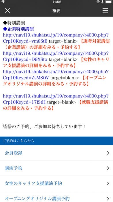各企業のパンフレットが参照出来るようになっています。またイベントの予約に対応していて、講演の概要をチェック出来るのも特徴です。就活の最新情報を入手していけるのも魅力ですね。