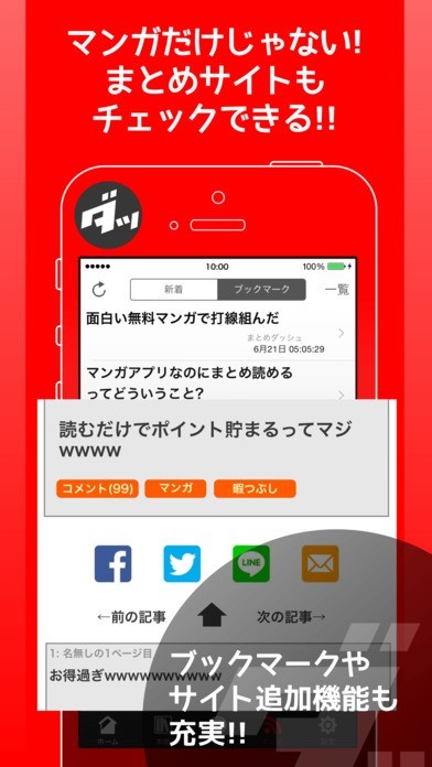 「マンガDASH」を利用することによって、2000話以上の作品が読むことが出来るようになります。 また、会員登録が一切必要ないので個人情報を記入する心配もしないですみます。 このマンガの特徴としてはマンガを読み終わることでポイントが得られるということで、たくさんマンガを読むことによってどんどんポイントを貯めることができます。 また、そのポイントを活用して「シークレット作品」を読んだり、まだ公開していない作品も読んだりすることも出来ます。 他にはマンガを読むのに飽きてしまった場合にはまとめサイトも見ることが出来ます。 まとめサイトにはブックマーク機能やURLを追加するRSS機能もついているような便利なものなので、情報収集の手段としてとても役に立ちます。