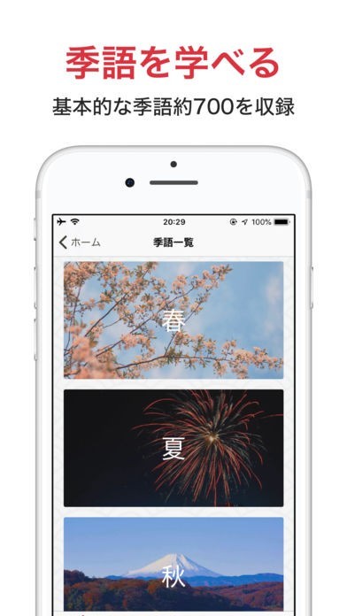 アプリ内には700弱の四季の季語が登録されています。それらの意味や使い方を学びながら素敵な俳句づくりに活かしてください。