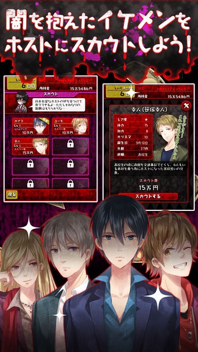 「ホストのアブナイ世界」は、ホストトクラブのオーナーになってホストクラブの経営を楽しめるシュミレーションゲームですが、中でもダークで真っ黒な裏経営をシュミレーションできる珍しいアプリです。闇のあるイケメンが揃ったホストクラブをいかに経営していくか、お客様から料金をお支払いいただき、資金を集めてお店を大きくしていきましょう。闇を抱えた男の子をスカウトしたり、どんどんメニューを増やしたり、お店の内装を変えたり、どんどん注文を入れていきます。一度やりだしたら止まらないシュミレーションゲームです。