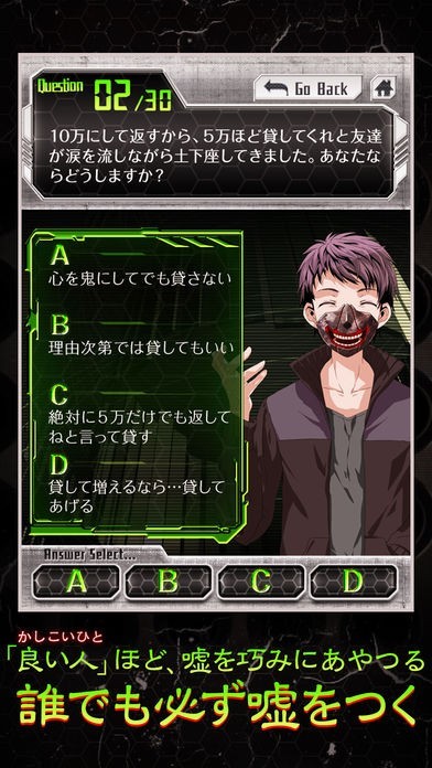 自分が嘘ばかりついていた事が分かるので面白いアプリです暇なときやるには最高です。
