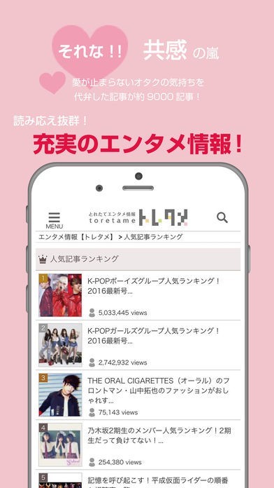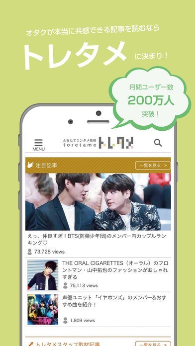 月間のユーザー数が200万人突破した人気のエンタメ情報が多数紹介されている!