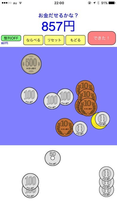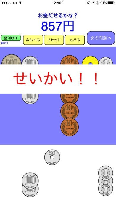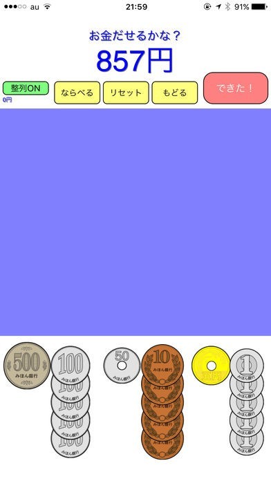 上に表示された金額になるように、真ん中の青い四角の中に硬貨を移動することにより、正解か、多いか、少ないか確認できます。