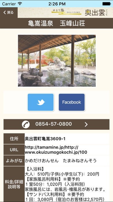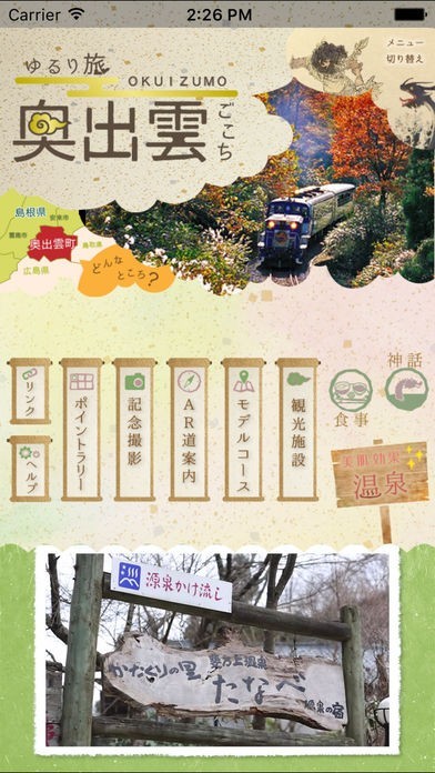 出雲大社で有名な島根県出雲市のさらに奥地、奥出雲の観光をサポートするアプリです。 奥出雲は日本神話に深く関わりのある土地で、関連施設も数多く存在します。 このアプリではその施設をまとめて観光をサポート、温泉やお食事処、温泉地などの詳細が記載されており、アプリから直接電話をかけることができるので問い合わせもスムーズにできます。 また、リンクからは奥出雲町公式観光ガイドのサイトに飛ぶこともできるので、そちらから体験プランやツアーを申し込むことも可能です。