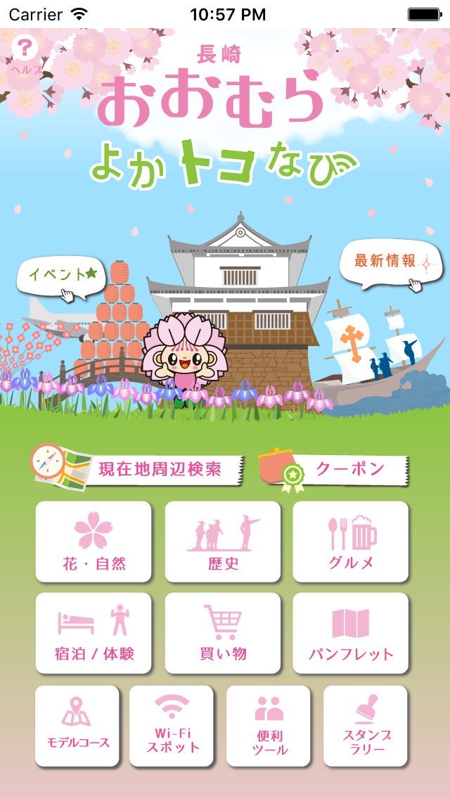 App Storeより引用クーポン付!「おおむらよかトコなび」は「花と歴史のまち」長崎県大村市のお出かけスポットや観光情報を調べることができる、便利な無料アプリです。