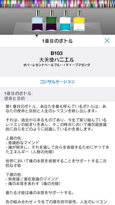 4つのボトルに様々な色を組み合わせていきます。それぞれのボトルは使命や才能などを表しています。また、現時点の状況や未来について関係しているボトルも存在しています。