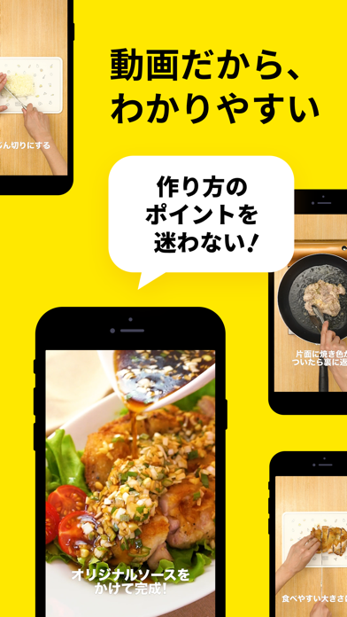 短い動画で、見やすい。スタートストップが素早くできるため、料理中でも楽につかえる。レシピの種類が豊富。