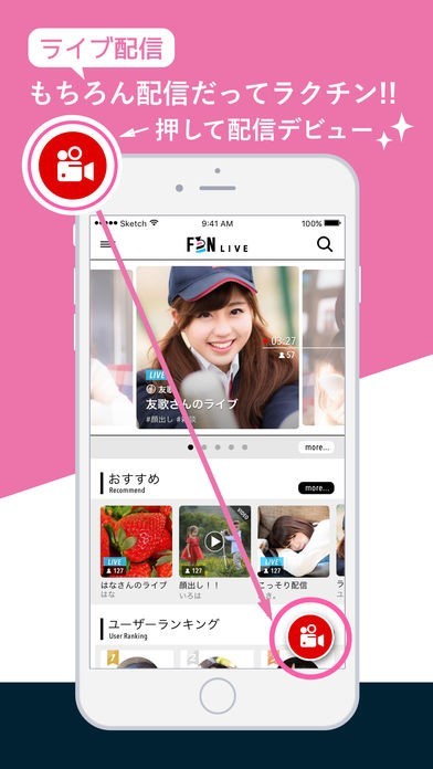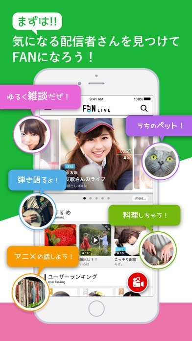 「FAN LIVE 高画質配信と視聴ができる国産ライブアプリ」は手軽に他のユーザーのライブが視聴できるので、ライブ配信の研究にうってつけです!人気のライブはランキングで表示されるので、ファンの多い有名なユーザーを研究する事が可能です!
