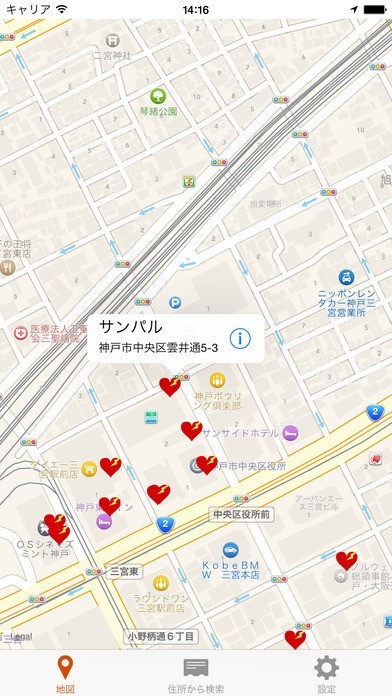 このアプリは神戸市に住んでいる方がどこにAEDが設置されているのかを知ることが出来ます。よって、特に心臓に問題を抱えている方やその家族は知っておくことによって命を救う可能性を高めてくれます。 場所はアプリ下部の左の「地図」をタップすることによりチェックすることができ、ハートマークが記載されていることから一目でどこにあるのかを把握することができますし、その場所への行き方もすぐに理解できます。 他にも、「住所から検索」によって、いる場所の住所を入力すれば近くにあるAEDの場所を知らせてくれます。