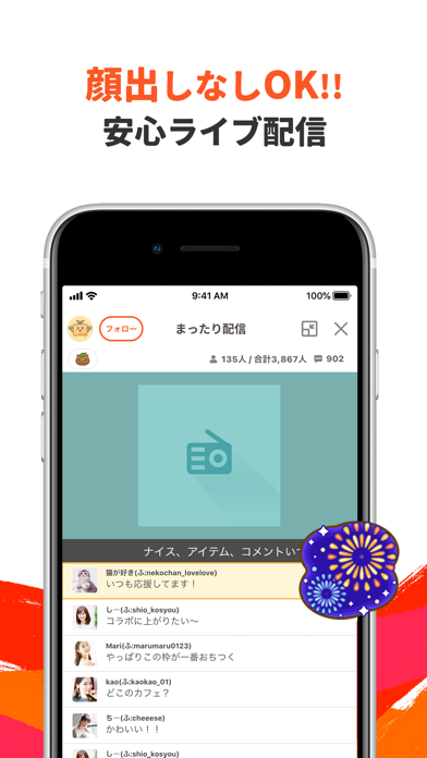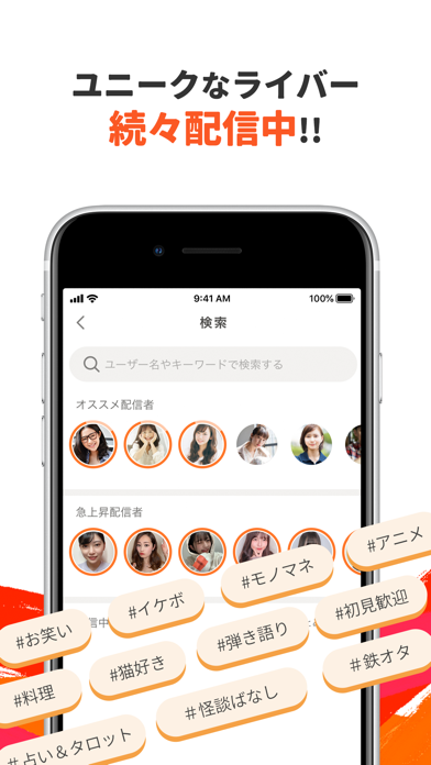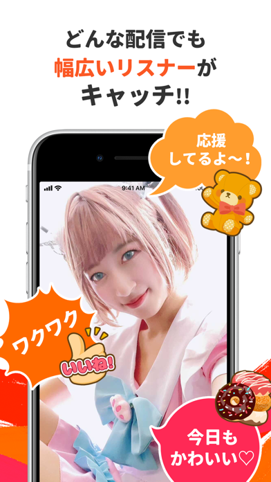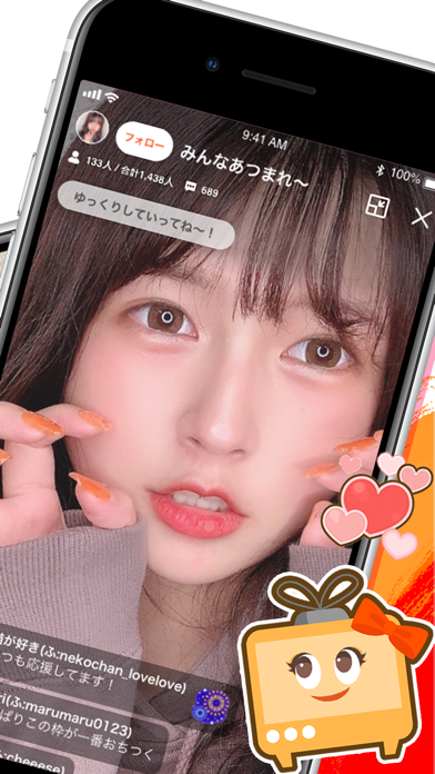 動画やラジオを生で配信することができ、配信を見ることもできます。タイムラグが1秒未満という速さで生配信を見ることができるので、配信者に反応をリアルタイムに伝えられます。配信者とコミュニケーションを取ることができ、用意されている様々なアニメーションや演出で配信を盛り上げることも可能です。配信を見たり盛り上げるとフォロワーランキングがどんどん上がっていきます。ランキング上位になると配信者の目に留まることもあります。豊富な検索で自分の好みに合う配信者を簡単に見つけられます。商品やオリジナルグッズが当たるビンゴゲームなどのイベントにも参加できます。