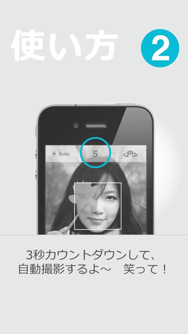 自撮りをよくする人にはうれしい、顔認識によるセルフタイマーアプリです。 もちろん自撮りってどんなスマホでも大体できるようになっています。 でも、失敗した事はありませんか?シャッターボタンが押しにくい所にあってブレたりなんてよくあります。 そこでこのカメラアプリ!起動すると自動的にインカメラになり自分の顔が映し出されます。 そしてカメラに正面から向かうと一瞬のバイブのあと、セルフタイマーのカウントダウンが始まります。 設定できるカウントは最長9秒まで。後はカメラに向かって渾身の笑顔を! 撮影した写真の画像補正もできます。自撮りのためのシンプルアプリ!