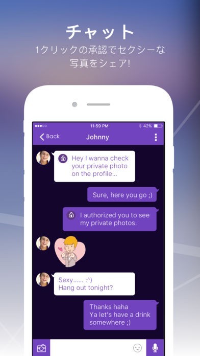 もちろん、一番基本的で重要な「チャット」機能もあります。全てのデートは簡単な「あいさつ」から始まります。オンライン上の簡単なタップ一つで、メンバーに挨拶をしましょう。