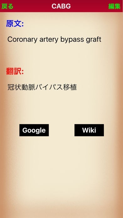 略語の原文と翻訳と一緒に「Google」と「Wiki」のボタンが表示されるので、さらに詳しい情報を知りたい場合はボタンをタップすればすぐに調べることができます。