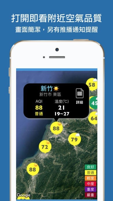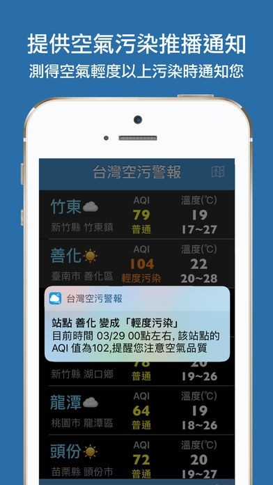 設定特定站點為推播通知關注點後,當該站點空氣品質變糟或變好時,即時推播通知給您。另外提供站點附近基本天氣預測資料。
