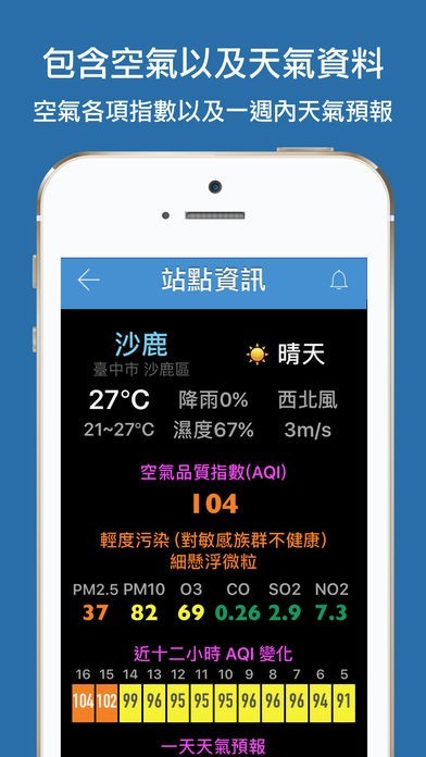 - 詳細頁面除了 AQI 以及近 12小時內 AQI 變化之外,提供 SO2、NO2、PM10、PM2.5、O3、CO,一天以及一週內的天氣預報。此頁右上角按鈕,可設定推播通知功能。