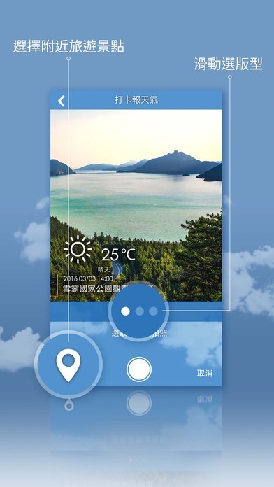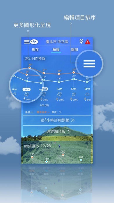 仕事や旅行などで中国、台湾に滞在中の週間天気予報や指定した場所の現在の天気、気温から3時間ごとの天気、降水確率、気温の表示から東京・大阪の天気・気温まで表示可能です