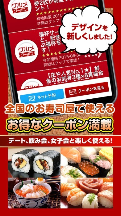 スマートフォンを使って寿司店で利用することができるクーポンを探すことができるアプリとなっていて、アプリを使用してネット予約をすることもできるようになっています。
