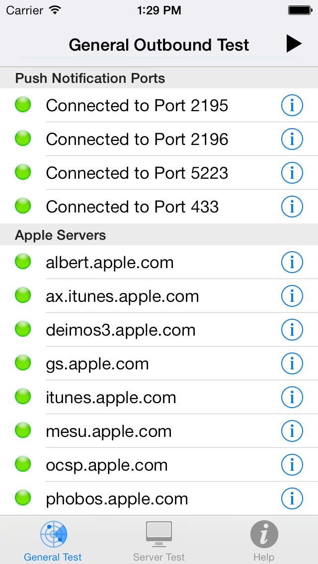 • The general mode checks whether key Apple servers and ports are open and reachable. Great for troubleshooting issues with services such as push notifications and activation.