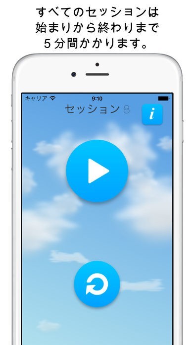 このアプリを使うことによって、いろいろな5分間で出来るリラックス方法を教えてくれるので、会社の休憩時間などを活用して、効率よく仕事が出来るようになります。 やり方は、音声で説明をしてくれることから、目を閉じながら行うことも出来ますし、解りやすいというメリットもあります。 セッション1から順番に行っていけばアンロックされて出来ることが増えていくので、長い間使い続けるとさらに便利になりますし、次の方法を試してみたくなるので、どんどんと行うことが癖になっていきます。 もし、もう5分間リラックスしたいと感じた場合はアプリ下部の再読込ボタンを押すことでもう一度実行することも可能です。 さいごに、解らないことがあれば、右上のインフォメーションボタンをタップすれば把握することが可能です。