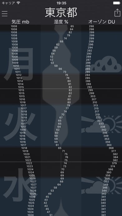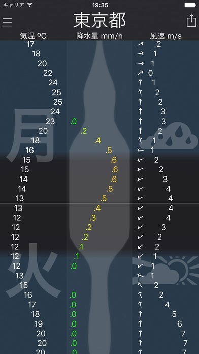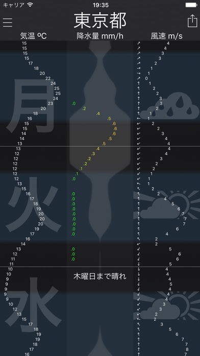 風向き、風速、紫外線、気圧など天気以外にも色んな気象予測がアプリ1つでできてしまいます。それぞれの数値や文字が1時間ごとに表示されるので、情報量の多い天気予報がチェックできます。