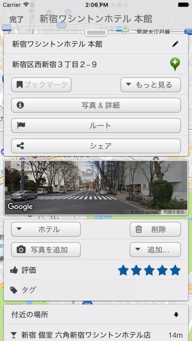 細かい住所を入力しなくてもある程度特定してくれます。その場所の周辺になにがあるのかも詳しく表示されるので、もし打ち合わせなどで向かう場合はレストランの検索も可能です。