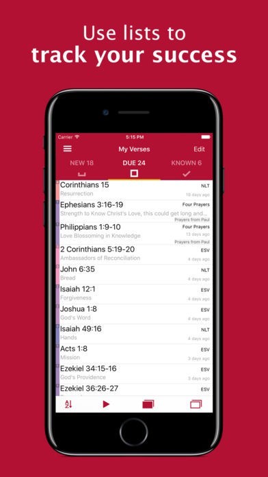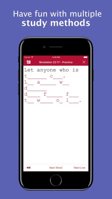 It is ideal for memorizing Bible memory passages, favourite poems, literary quotes, speeches, and vocabulary. Using the tabbed interface, it's easy to manage Scripture memory verses between the New, Due, and Known tabs.