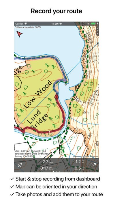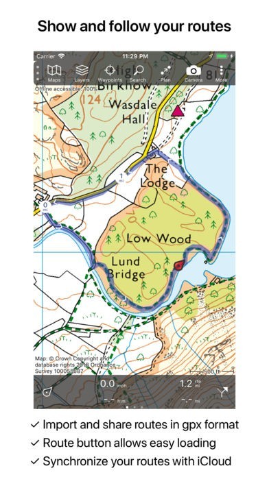 App Storeより引用Makes from your iPhone/iPad a complete GPS device with the detailed OS Explorer maps provided by Ordnance Survey. Viewed maps will be stored on your device so that Topo GPS can also be used without an internet connection.