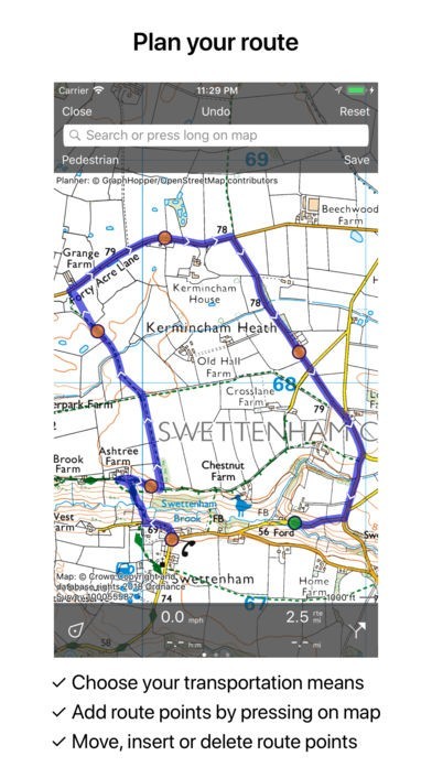 * Recording of routes, with pause and restart possibility.