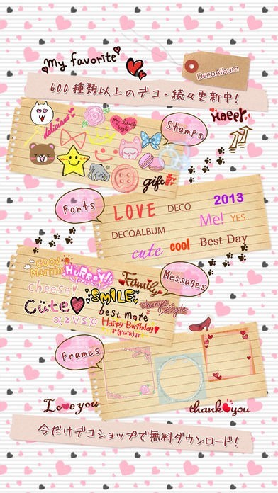 ・800種類以上のスタンプはプリクラ風デコアプリ最多だよ!デコも無料なのに可愛いくて使いやすいから、ブログやtwitter、facebookなどに写真を投稿して皆に自慢できるよ!