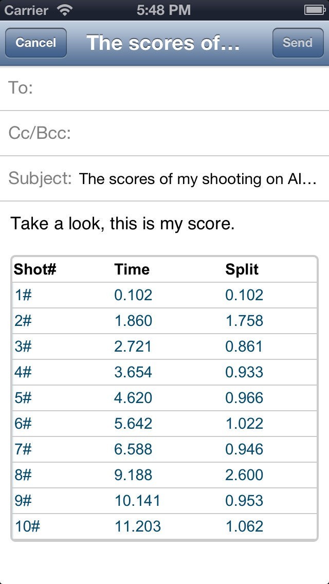 ショットタイマーとしての機能はもちろん、スコアを記録することも可能です。計測時の時間と射撃数、また初撃時間と合計時間が記録として残ります。またスコアはメールに添付することもできるので仲間と競うことも可能です。