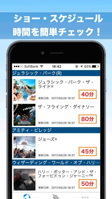 テーマパークとして人気のユニバーサルスタジオジャパン、せっかく行くならアトラクションを効率よく廻って楽しみたいですよね。 「待ち時間 for USJ」では、ユニバーサルスタジオジャパン内のアトラクションの予想待ち時間情報を配信! さらショーのスケジュールなども一緒に確認することができちゃいます! エリアごとにアトラクションを分け、待ち時間を見やすく表示してくれるので、自分の予定に合わせて行動できるのが嬉しいポイント。 どんなアトラクションなのか説明もしてくれるため、並んでいる間に次に行きたい場所を決めることもできるでしょう!