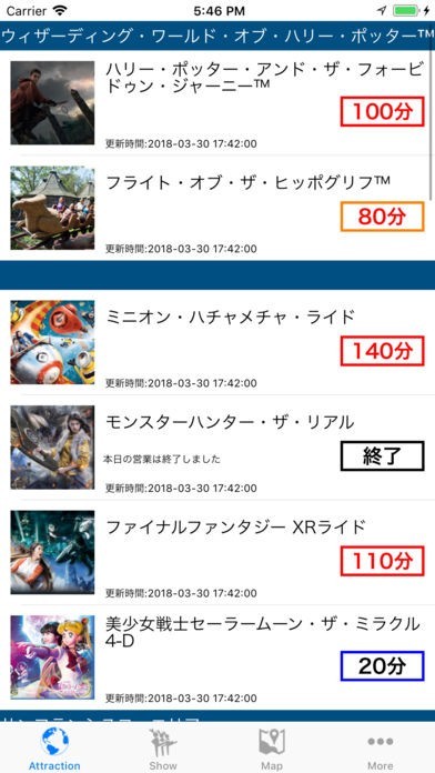 ユニバーサルスタジオのアトラクションの待ち時間がわかりやすく表示される。便利で使いやすい