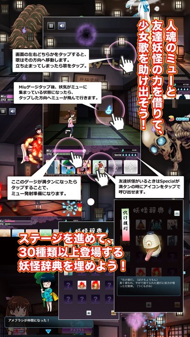 「歌と森の妖怪屋敷」は、タップで進めるブロック崩しアクションです。まるでアニメを操作しているような躍動感を味わうことができます!豊富なアニメーションパターンは700枚をこえていて日本各地にある様々な伝承された妖怪たちが、画面狭しと暴れ回っていきます。ゲームをクリアした後はもう一度全ての会話を見返したくなるかもしれません。色々な場面に散りばめられた物語のヒントを見逃さないようにしよう。このゲームは実は奥が深いので隠された設定を探すといったアクションも楽しみ方の一つです。