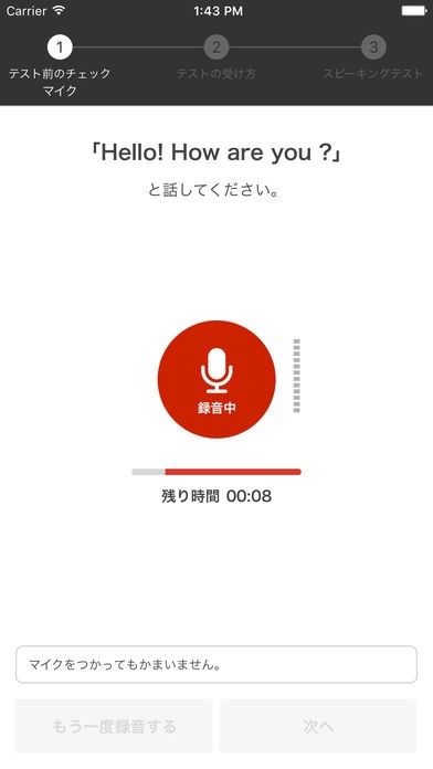 テスト中に流れる音声の音量調整を行い、マイクの動作確認では試しに音声を吹き込み、問題なく録音されているかを確認します。