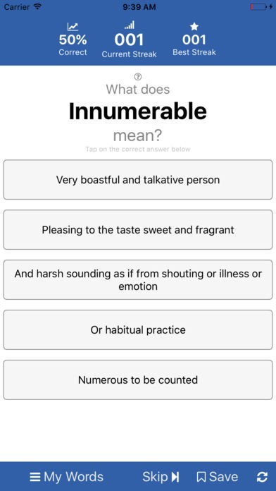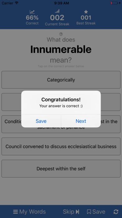 VocabQuiz tracks your overall performance and streaks of correct answer.