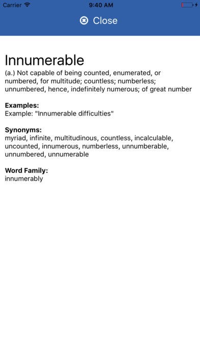 App Storeより引用With over 5,000 SAT words with definitions, part of speech, example sentences, synonyms and word families, VocabQuiz is the best way to practice your vocabulary!