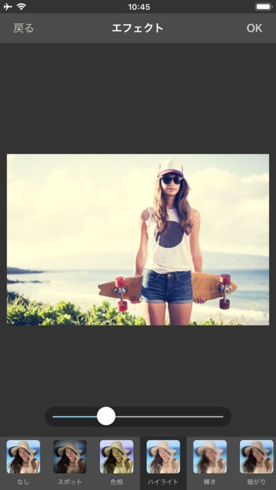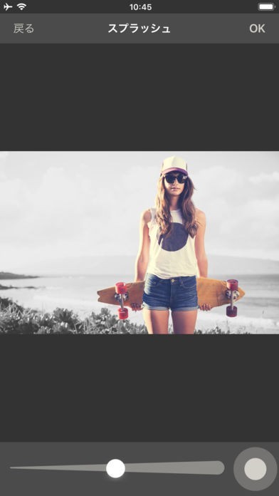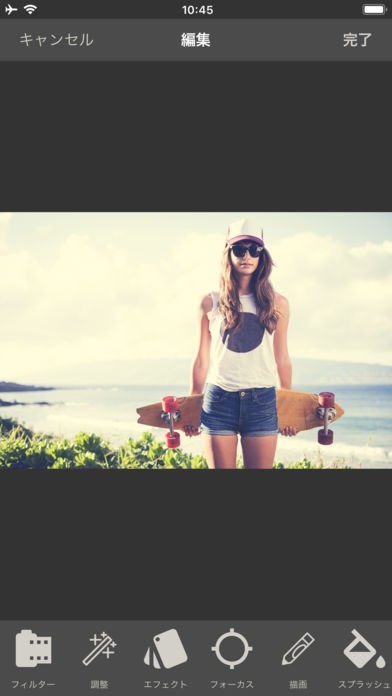 簡単な画像編集機能も搭載しており、フィルター機能では写真全体のイメージを変更したり、エフェクト機能では画像の彩度の調整が行えます。そのほかスプラッシュ機能やテキスト挿入機能も搭載。完成したファイルはアルバムに保存でき、設定によって編集後に元画像を削除するオプションも選択できます。