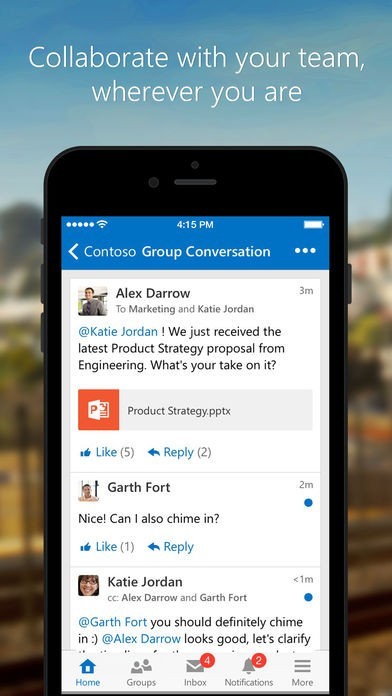 "Yammer"は、メンバーとの会話や最新情報の投稿を始め、共同作業が場所を問わずに行えるコラボレーション環境を可能とするアプリです。搭載機能の1つである"Yammer for iOS"では、タップするだけで、メンバーと連絡を取ったり、情報を共有したり、会話をすることを可能とします。また、画像の共有機能により、写真や動画を取り込めば、ファイルのサイズに関係なく容易に共有する事が可能となっています。さらに、瞬時に処理統合されるメッセージ翻訳機能は、25か国語に対応しています。これらは、パスワードを設定する事で情報の漏洩が防げ、パスワードの設定も有効期限や複雑度などを調整する事が可能です。企業内において、スマートフォンを利用し、シンプルな操作でメンバーにメッセージやファイル、リンク等を共有したり、ディスカッションをしたい際に最適です。