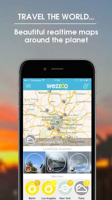 「wezzoo」はフランス発のお天気アプリです。 ただの天気予報アプリではありません! 面白いのは世界各地の天気だけでなく、空模様の写真を見られること! 各国のユーザーが、自分の撮った空の写真をアップしているので、世界中の見たことのない景色にも出会えるはず。 もちろん自分も天気の写真をアップすることで世界中の人とつながることができます。 独自の天気図を使っているのですが、晴れや曇り、雨などわかりやすい。 しかもリアルタイムなので、海外に住む友達と、また大切な恋人と天気を共有することもできちゃいます。 お天気はとっても身近でコミュニケーションの第一歩。このお天気アプリでより一層仲が深まりそうです。