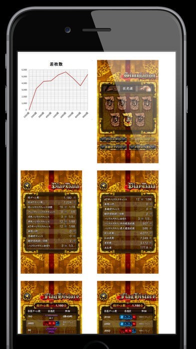 各機種ごと、各設定ごとにシミュレートしたスランプグラフや差枚数のデータを、チェックすることができます。さまざまなパターンを視覚的に確認することによって設定を把握できるようになります。