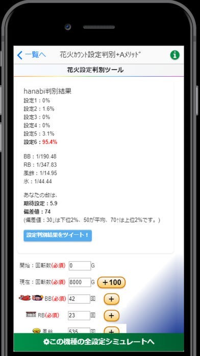 ゲーム数やボーナス回数を打ち込むだけで簡単に設定を把握することが可能です。難しい操作や解説はないので初心者の方でも安心して利用する事ができます。また、途中からのゲーム数でもきちんと判別してくれますよ。