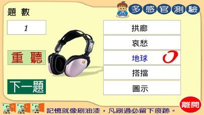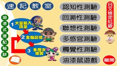 包括認知性測驗、回溯性測驗、聯想性測驗、多感官測驗、觸覺性測驗、遊戲鼠遊戲等單元,以及油漆式速記心法的說明按鈕。